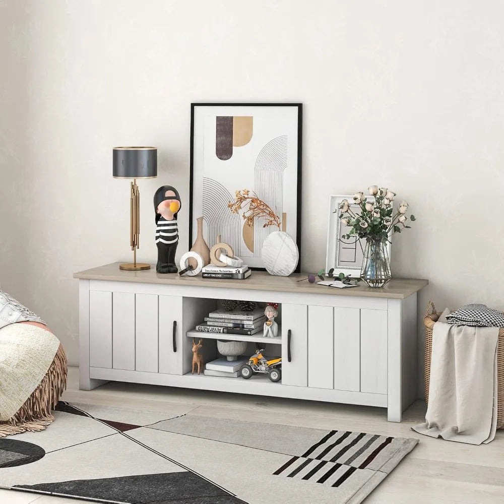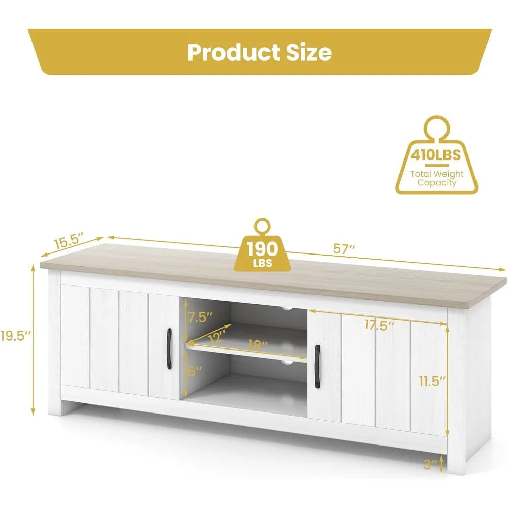 2 Doors TV Stand for TVs up to 65”, 57” Media Console Table w/ 2 Cabinets & Open Shelves, 2 Cable Management Holes. Woo
