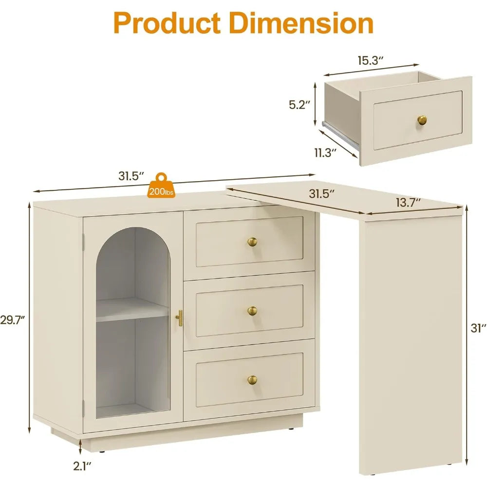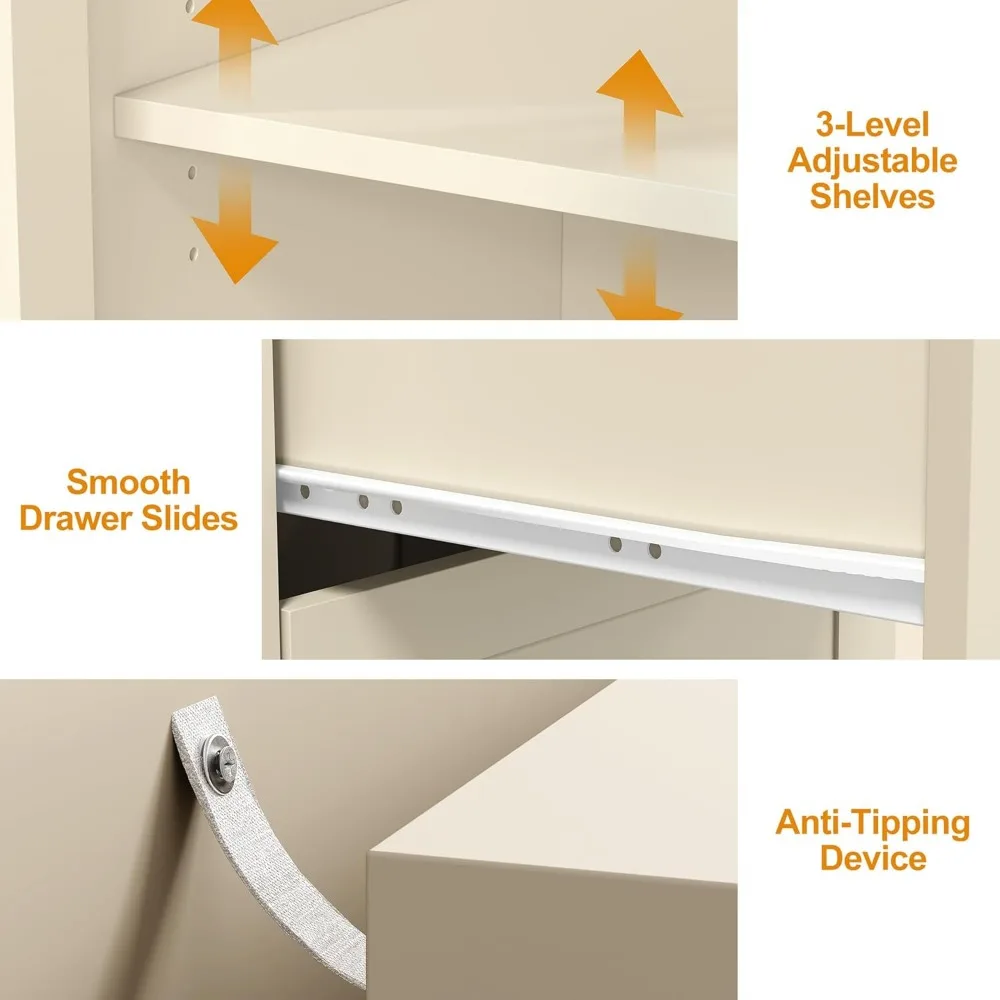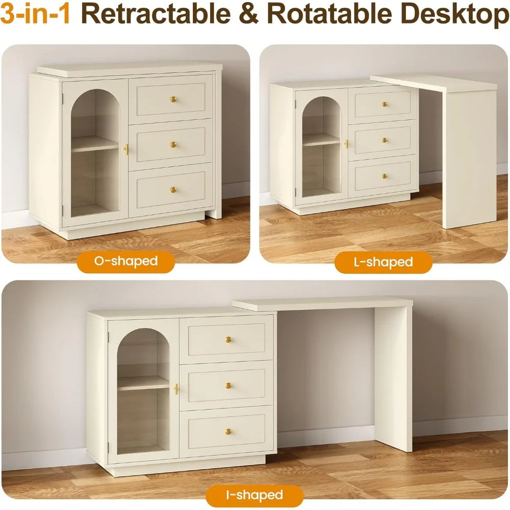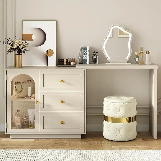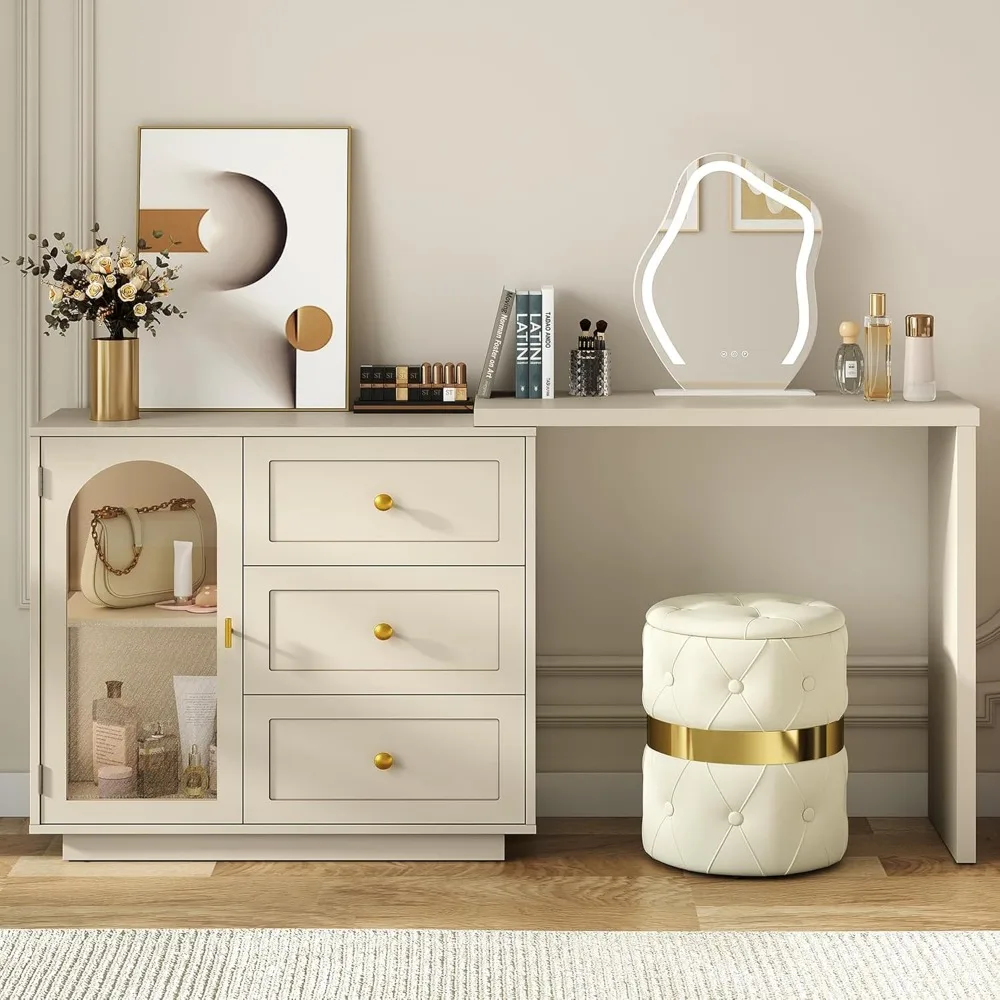 59” Large Makeup Vanity Desk, Beige L Shaped Corner Vanity Table with 3 Drawer & 2 Door, Modern Extendable Dressing T