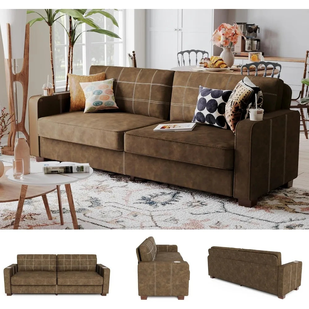 80 Inch Brown Faux Leather Sofa Couch - Wide Armrests with 2 Built-in Cup Holders, Deep Seats, Contrast Stitching, Oversized Lea
