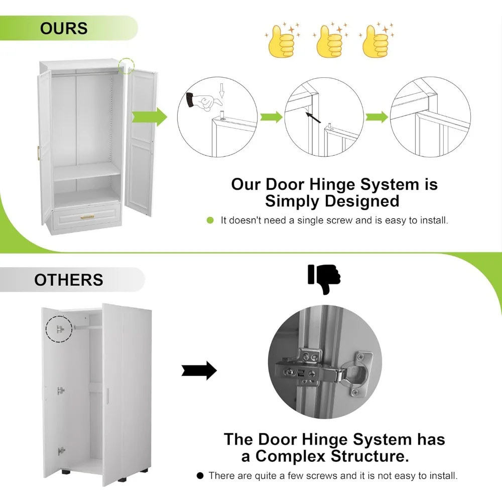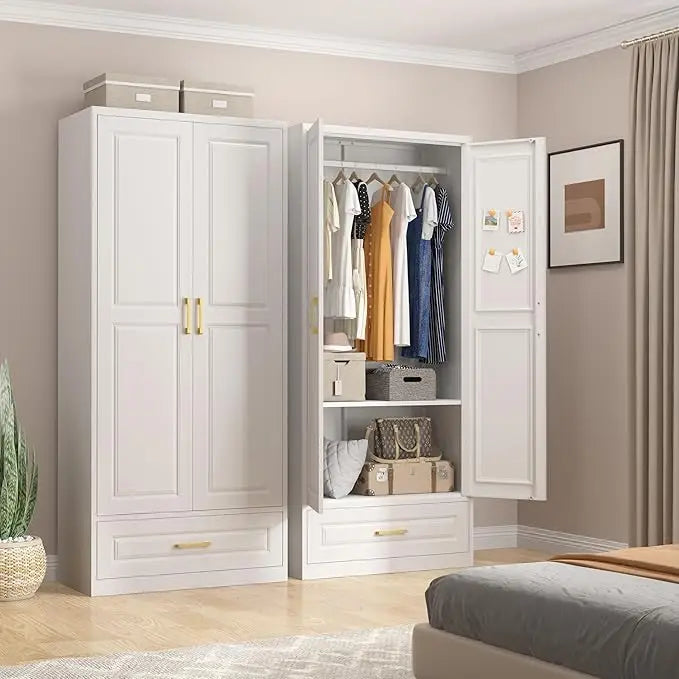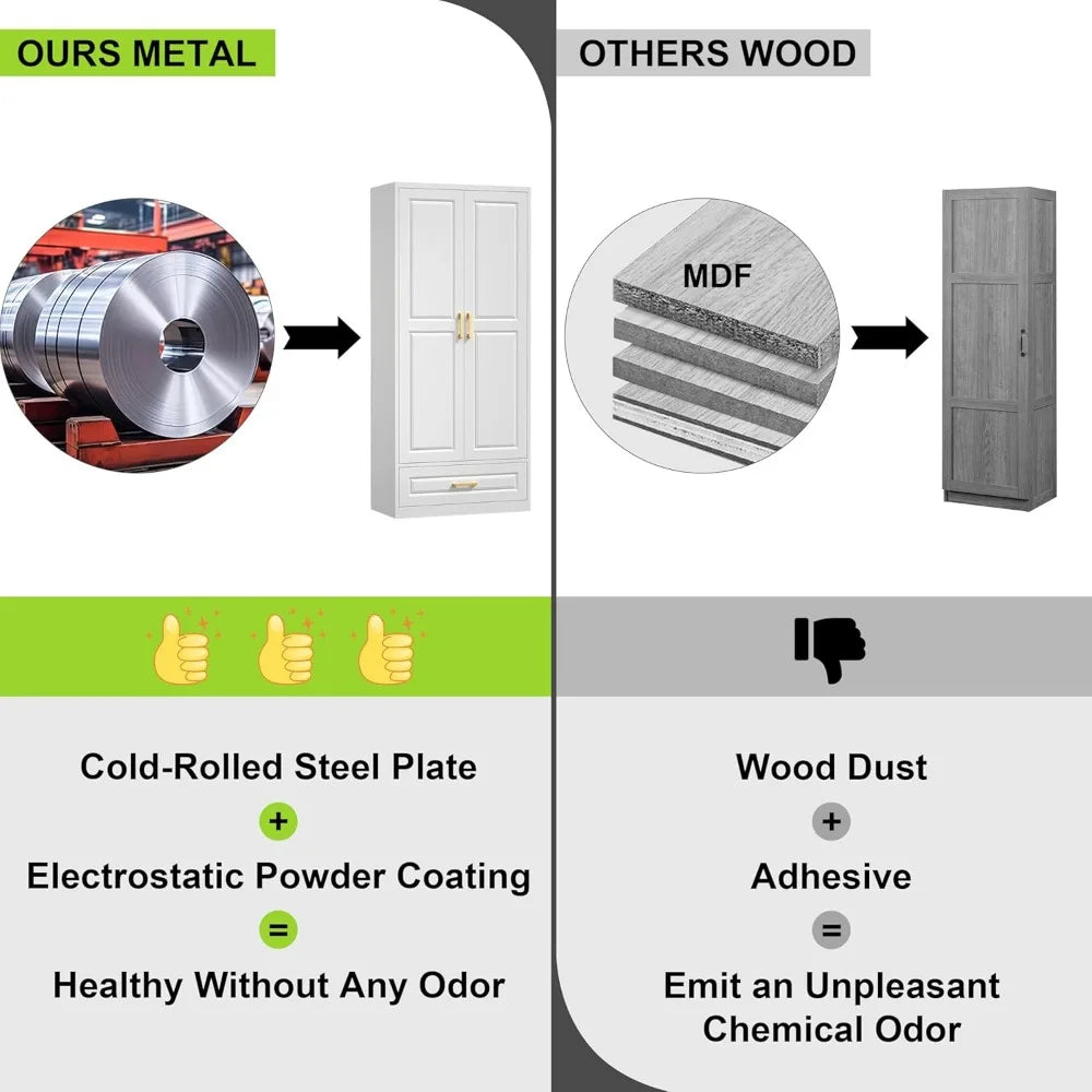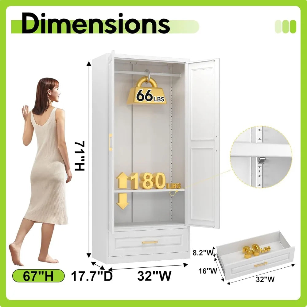 Armoire Wardrobe Closet with Doors, 71'' Wardrobe Cabinet with Hanging Rod, Metal Closet with 2 Adjustable Shelves for Bedroom S