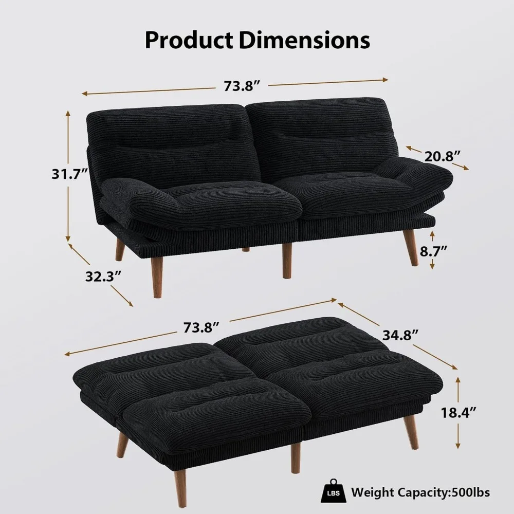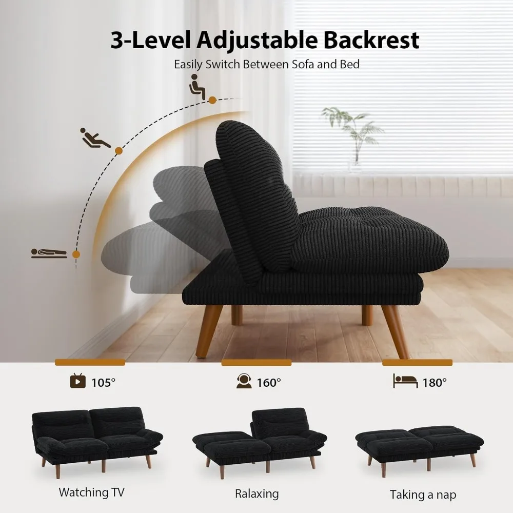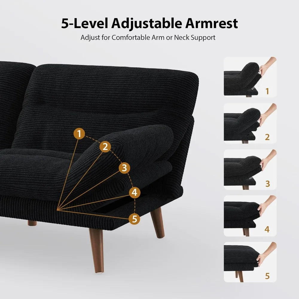 Convertible Futon Sofa Bed, 66" Corduroy Futon Couch with Adjustable Backrest and Armrests, Recliner Sleeper Sofa for