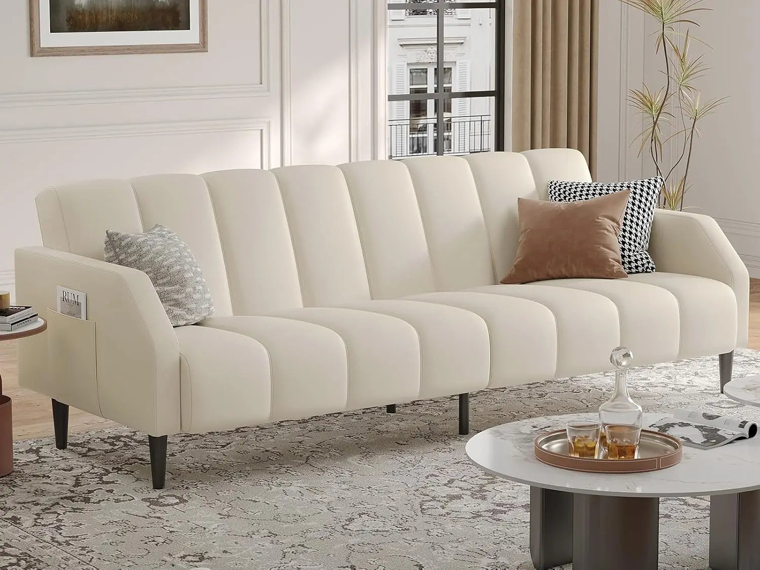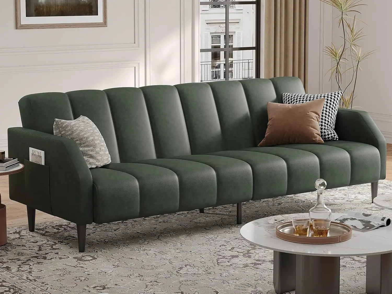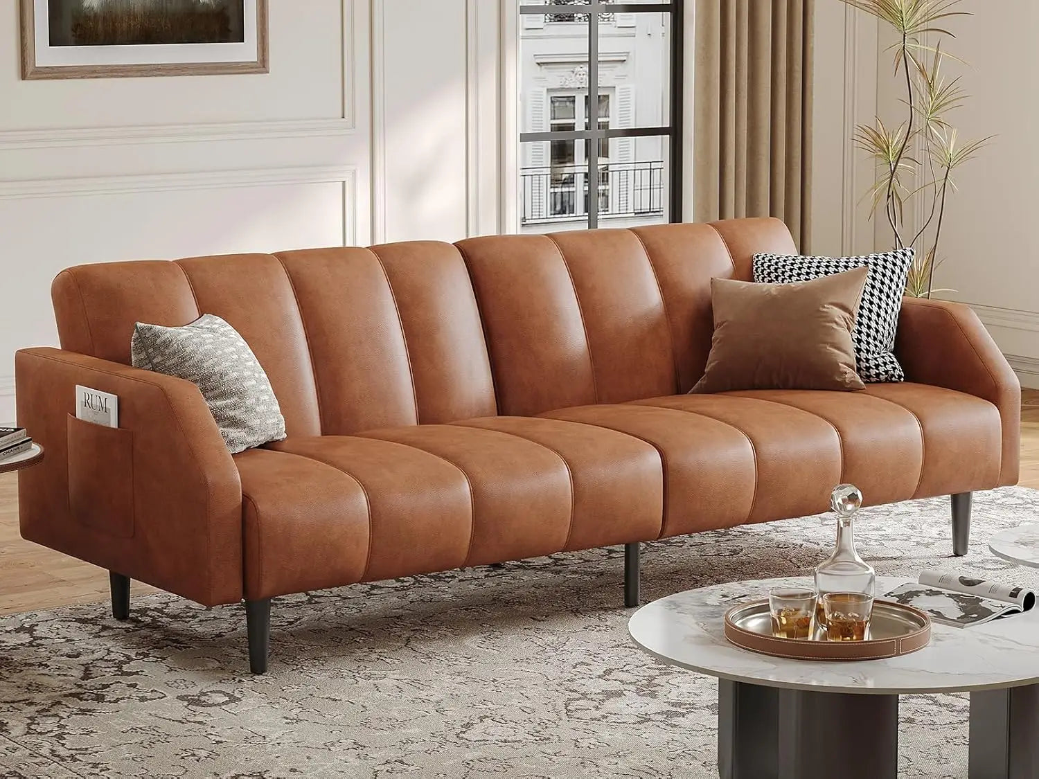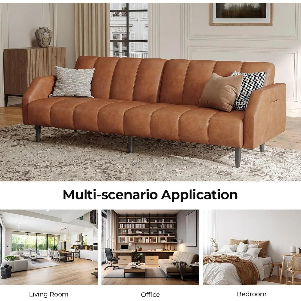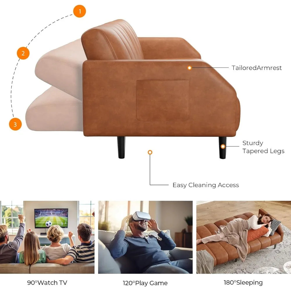 Faux Leather Couch, Convertible Futon Sofa Bed with Adjustable Backrest, Mid Century Leather Sofa Loveseat with Side Poc
