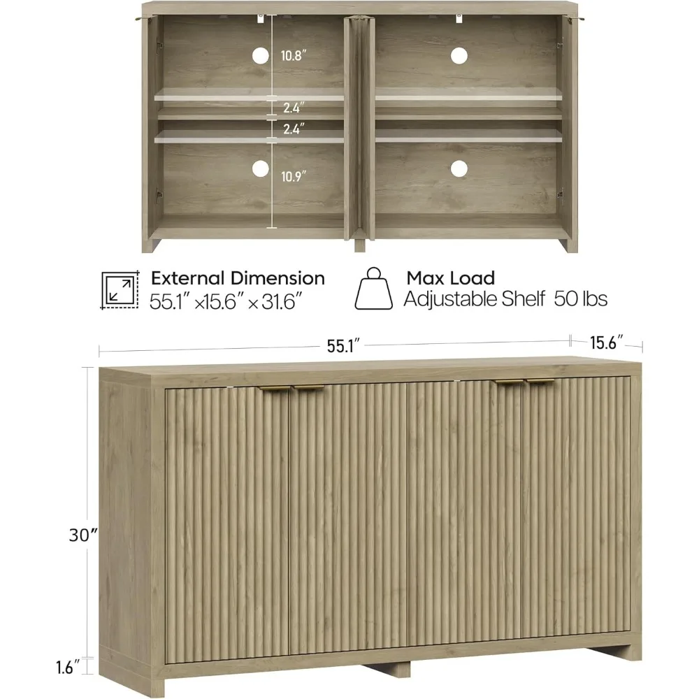 Fluted Buffet Cabinet, 55in Sideboard with Adjustable Shelves and 4 Doors,Storage Cabinet for Living Room