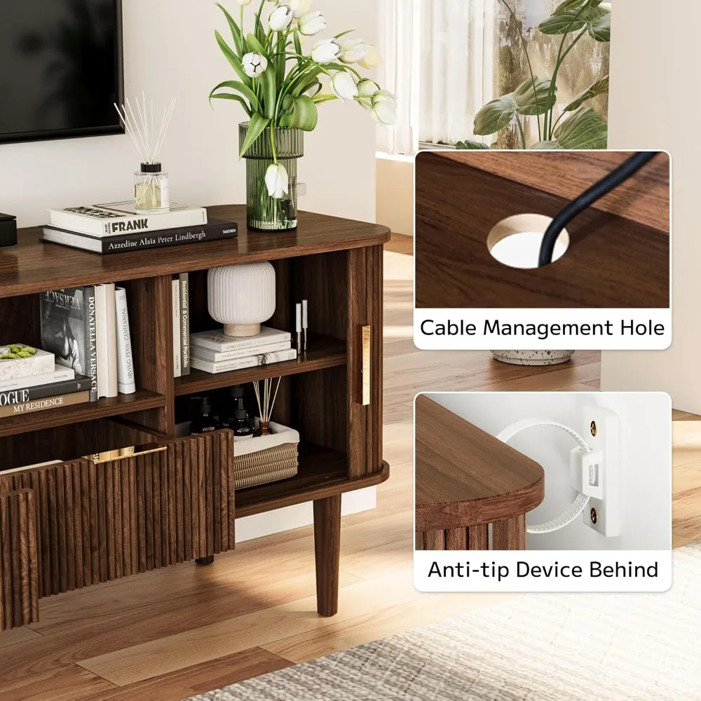 - Media TV Console: With tambour sliding door, this innovative design saves space but also enhances accessibility, making organization effortless and stylish. Wood tv stand with sleek curve round edge offer an environment safe for kids and family