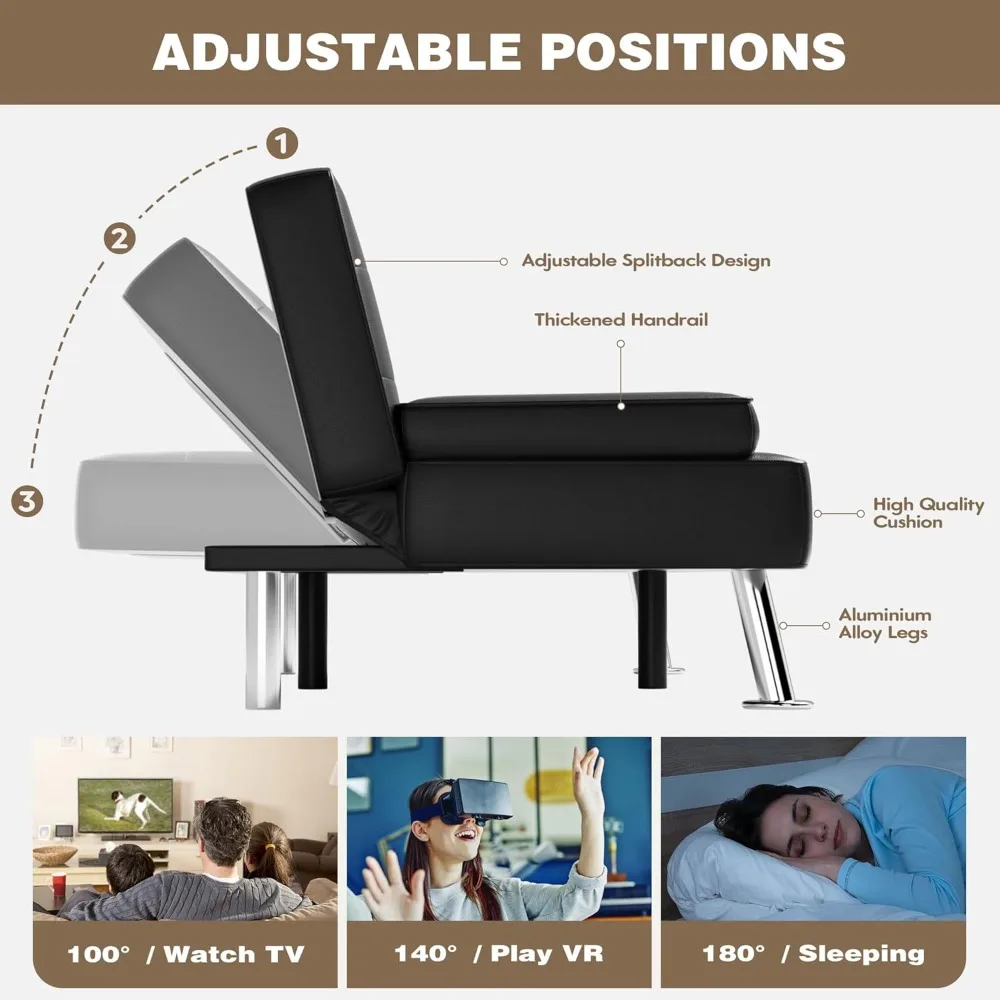 Futon Sofa Bed, Leather Futon Couch with Removable Armrests, Adjustable Recliner Sleeper Sofa Bed with Dual Cup Holders f