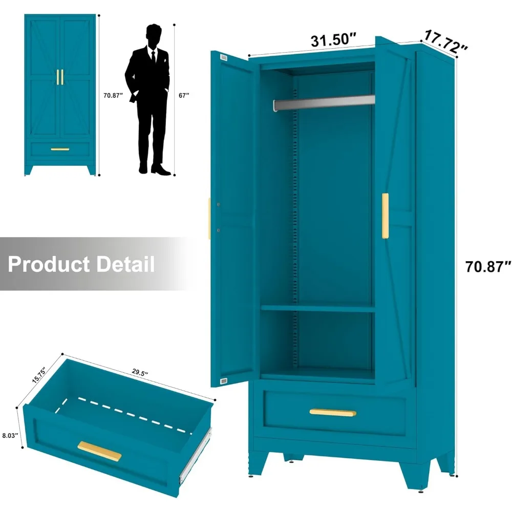 Metal Wardrobe Cabinet,71 Armoire Wardrobe Closet with Drawers and Hanging Rod,Metal Armoire with Adjustable Shelves for Closet,