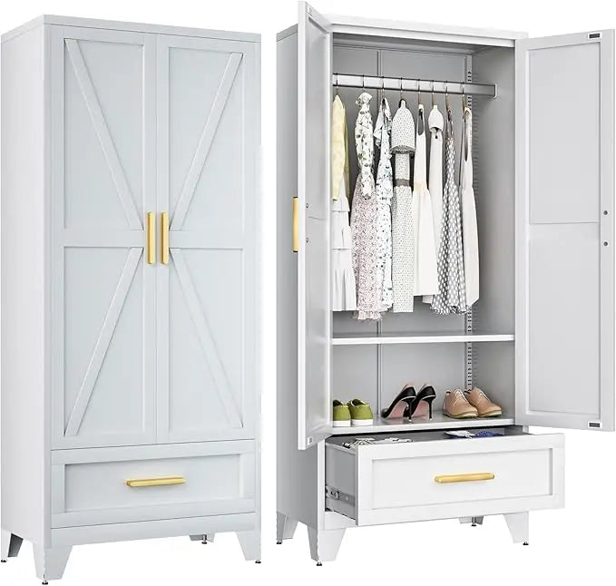 - Farmhouse-Style Aesthetic: The door panel of the metal wardrobe closet is designed with a charming farmhouse aesthetic, adding a touch of rustic elegance to your space. Storage cabinet has classic design complements a variety of decor styles, making it a versatile choice for any room