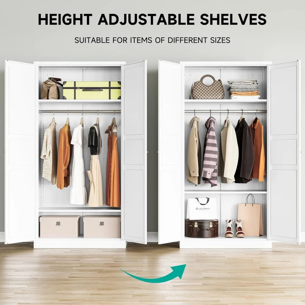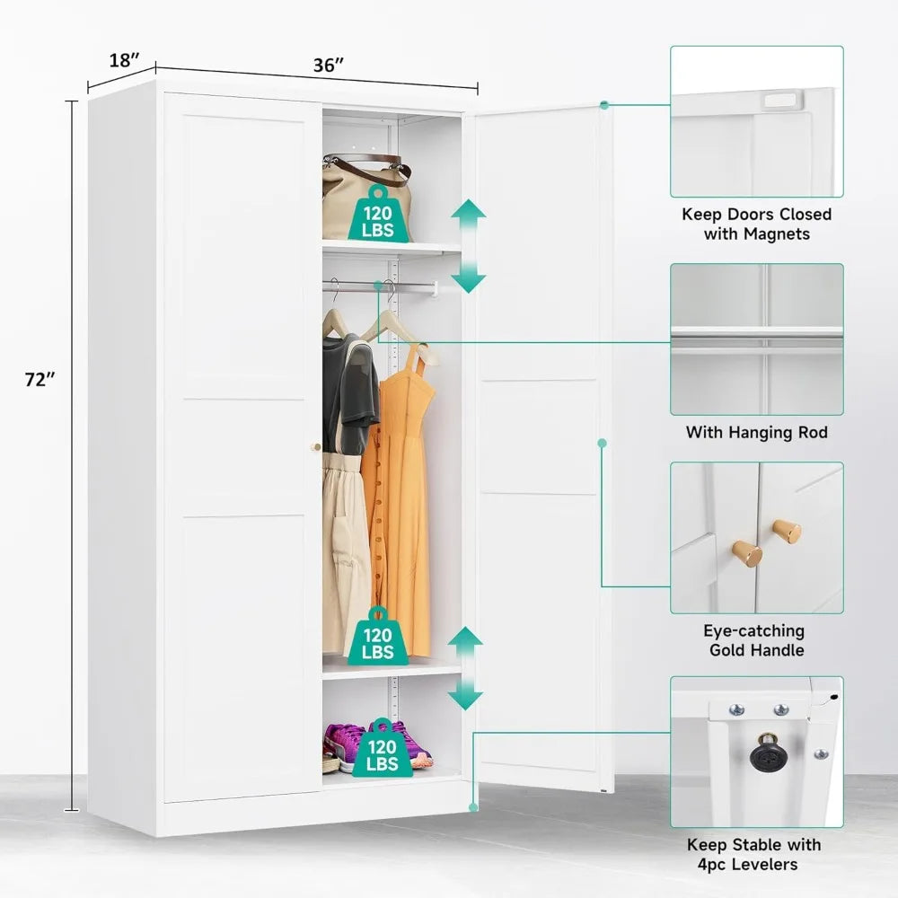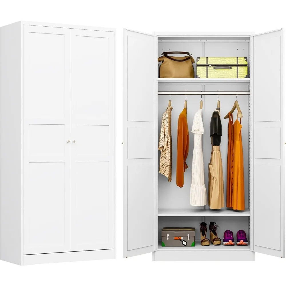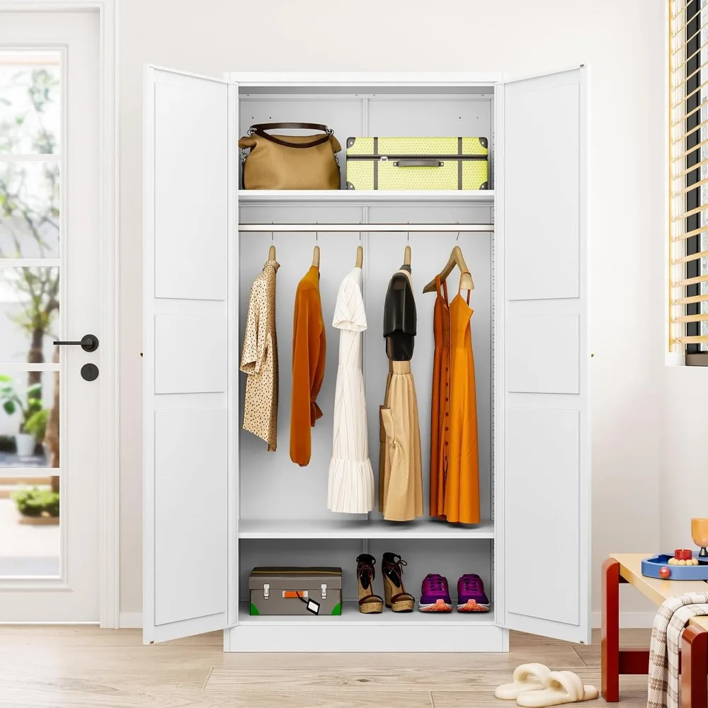 Metal Wardrobe Cabinet,Armoire Wardrobe Closet with doors,White Metal Clothing Storage Cabinet with Adjustable Shelves and Hangi