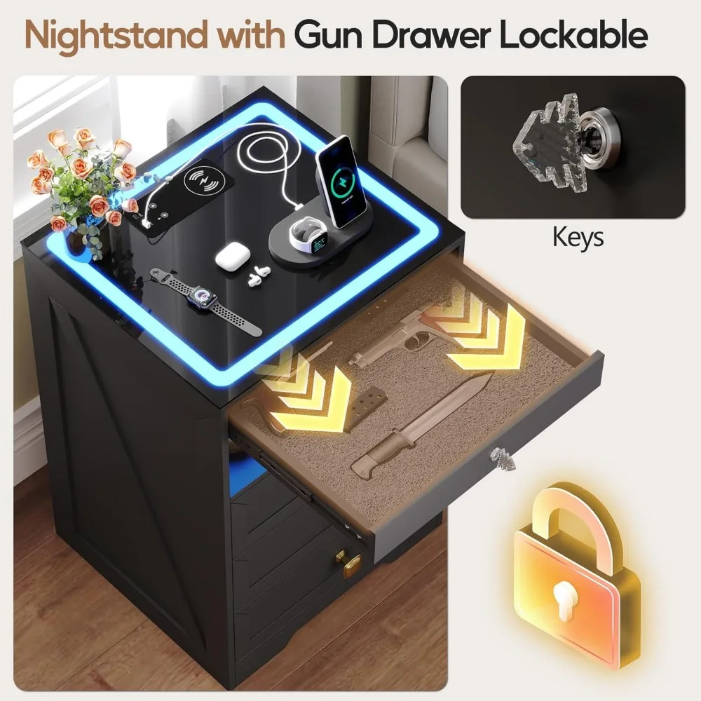 Smart Nightstand with Lockable Gun Drawer,Farmhouse Bedside Table with Charging Station and 3 LED Lights, Modern Night Stand wit
