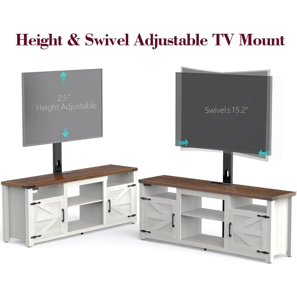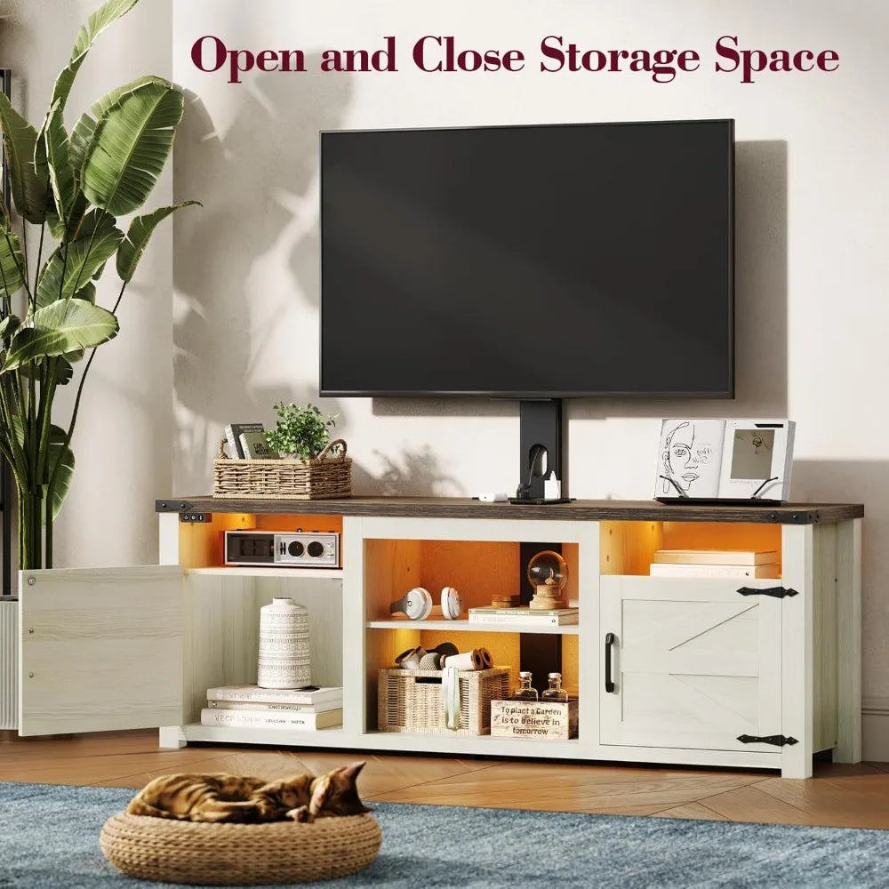 - Ample Storage Space : The TV stand features a large tabletop, open storage compartments and barn door cabinets to accommodate various items such as DVDs, game consoles, keeping your living space tidy and pleasant