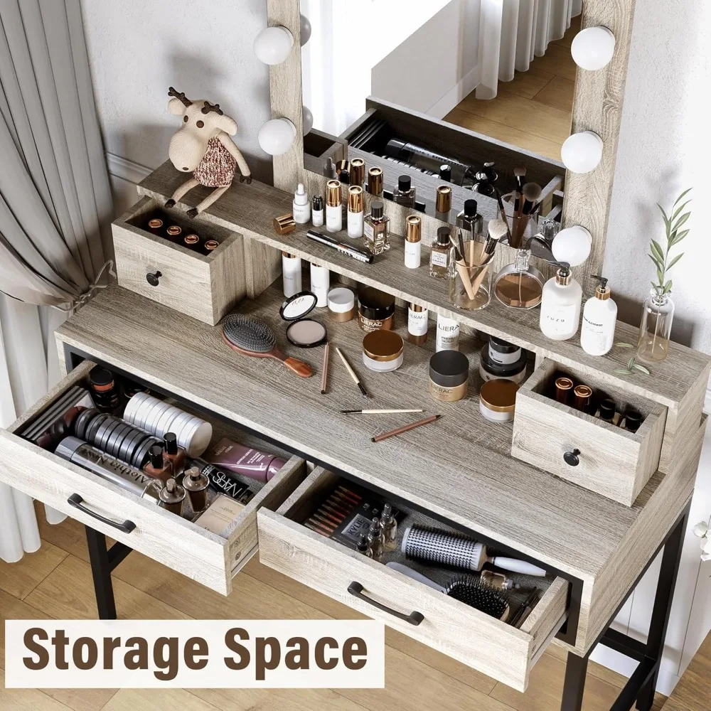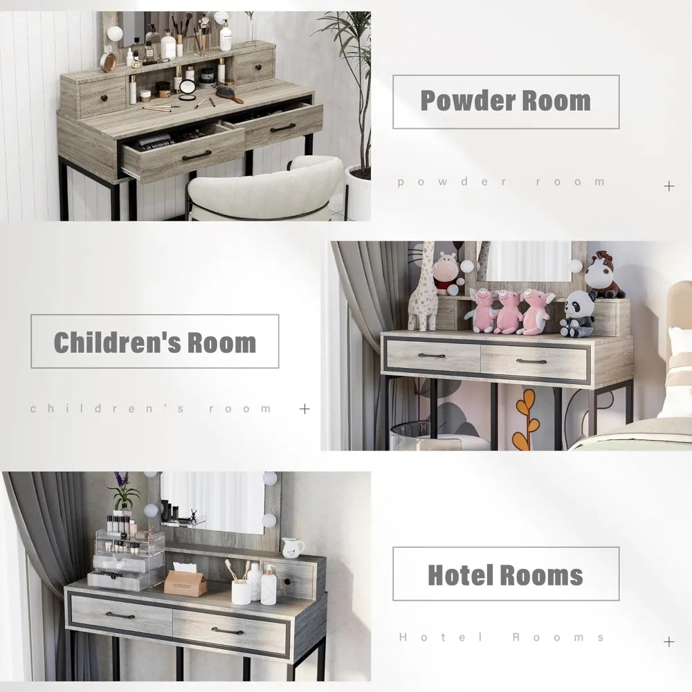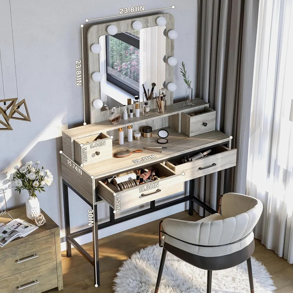 Vanity Desk with Mirror and Lights, Makeup Vanity with 3 Color Dimmable Lighted Hollywood Mirror, Light Grey Makeup T