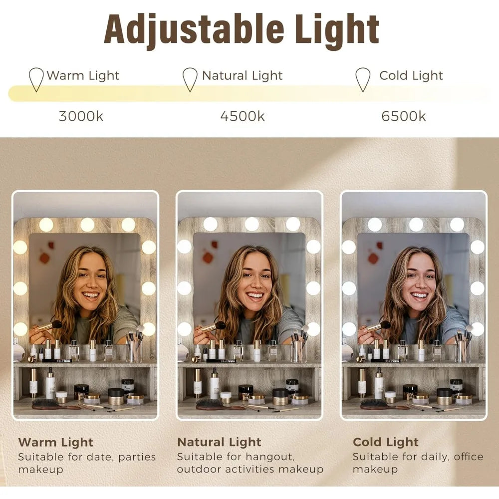 - 💄【3 Colors & 10 brightness levels】 The vanity desk with big Hollywood mirror featuring 9 radiant LED lights, 3 stunning colors (White, Cold, Warm), and 10 brightness levels. You can adjust the right color and brightness according to your makeup needs and scene, help you create the perfect look.